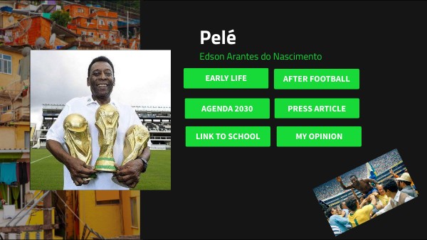 Born: 20 Oct 1940 in Três Corações, Brazil Profession: football player What he did: -sock to O Rei - 3 World Cups: -Sweden 1958 - Chile 1962 -Mexico 1970 -he coined the phrase “ the beautiful game” -racism in Brazil -taught by example