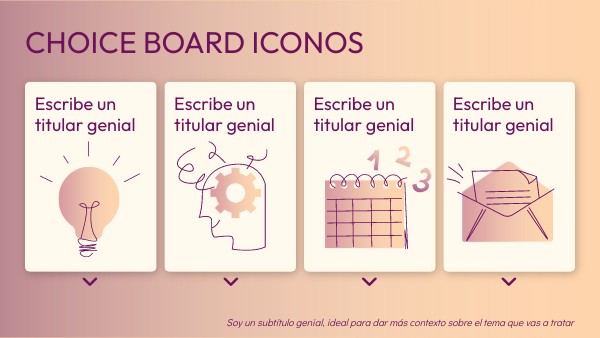 Plantilla gratuita para crear un tablero interactivo con iconos relacionados con el mundo de la educación superior. Ideal para la enseñanza a distancia, permitiendo al alumnado seleccionar actividades, recursos y materiales didácticos de forma dinámica e innovadora. Es muy sencillo de editar ya que