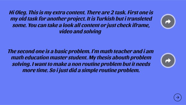 Hi Oleg. This is my extra content. There are 2 task. First one is my old task for another project. It is Turkish but i transleted some. You can take a look all content or just check iframe, video and solving