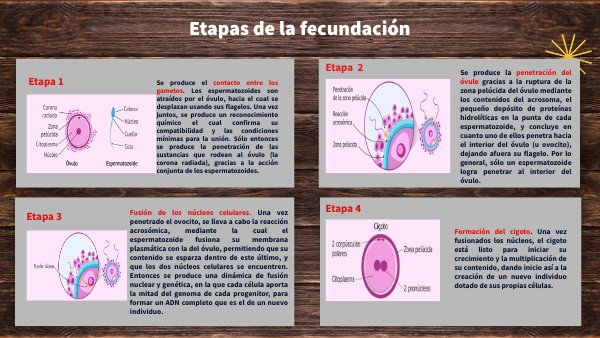 Fusión de los núcleos celulares. Una vez penetrado el ovocito, se lleva a cabo la reacción acrosómica, mediante la cual el espermatozoide fusiona su membrana plasmática con la del óvulo, permitiendo que su contenido se esparza dentro de este último, y que los dos núcleos celulares se encuentren. Entonces se produce una dinámica de fusión nuclear y genética, en la que cada célula aporta la mitad del genoma de cada progenitor, para formar un ADN completo que es el de un nuevo individuo.
