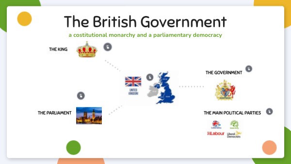 The UK is a constitutional monarchy and a parliamentary democracy. This means that the Head of State is the monarch, but the real power is in the hands of Parliament. Parliament is made up of three parts: the King, the House of Commons and the House of Lords. The seat of the British Parliament is the Palace of Westminster in London with its popular clock tower, Big Ben. It is on the bank of the River Thames.