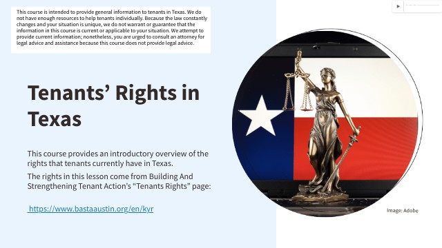 This course is intended to provide general information to tenants in Texas. We do not have enough resources to help tenants individually. Because the law constantly changes and your situation is unique, we do not warrant or guarantee that the information in this course is current or applicable to your situation. We attempt to provide current information; nonetheless, you are urged to consult an attorney for legal advice and assistance because this course does not provide legal advice.