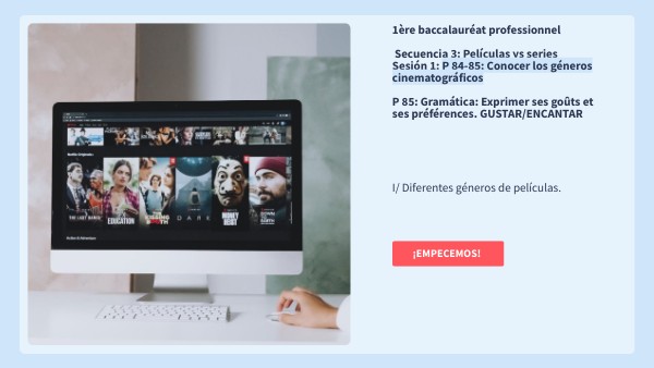 1ère baccalauréat professionnel Secuencia 3: Películas ys series Sesión 1: P 84-85: Conocer los géneros cinematográficos P 85: Gramática: Exprimer ses goûts et ses préférences. GUSTAR/ENCANTAR