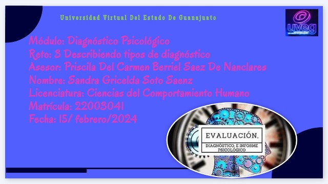 Módulo: Diagnóstico Psicológico Reto: 3 Describiendo tipos de diagnóstico Asesor: Priscila Del Carmen Berriel Saez De Nanclares Nombre: Sandra Gricelda Soto Saenz Licenciatura: Ciencias del Comportamiento Humano Matrícula: 22003041 Fecha: 15/ febrero/2024