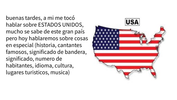 buenas tardes, a mi me tocó hablar sobre ESTADOS UNIDOS, mucho se sabe de este gran país pero hoy hablaremos sobre cosas en especial (historia, cantantes famosos, significado de bandera, significado, numero de habitantes, idioma, cultura, lugares turisticos, musica)