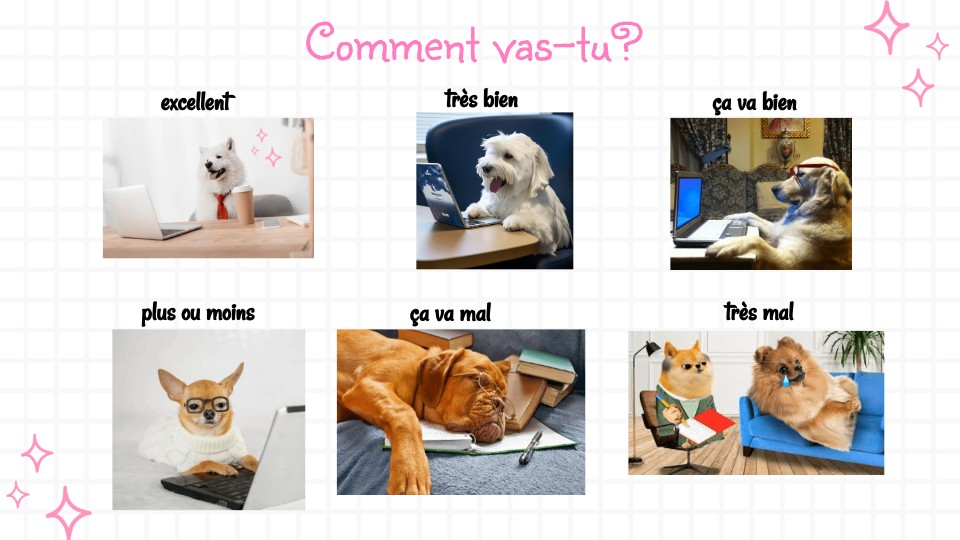 Bonjour ! Je m’appelle Jean. Je vais à l'école en France. Dans mon sac à dos il y a un livre, un cahier et un stylo. Il y a aussi des ciseaux, des écouteurs, une règle et, le plus important, il y a des bonbons.