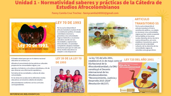 REFERENCIAS BIBLIOGRAFICAS Ley 725. (2001). Día Nacional de la Afrocolombianidad. Congreso de Colombia. Función Pública. https://www.funcionpublica.gov.co/eva/gestornormativo/norma.php?i=4598 Ley 70. (1993). Ley de comunidades negras congresode la república Colombia: https://www.acnur.org/fileadmin/Documentos/BDL/2006/4404.pdf?file=fileadmin/Documentos/BDL/2006/4404iew/1376/971