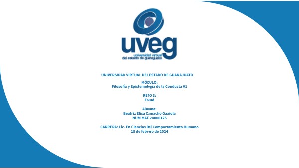 MÓDULO: Filosofía y Epistemología de la Conducta V1 RETO 3: Freud Alumna: Beatriz Elisa Camacho Gaxiola NUM MAT. 24000125 CARRERA: Lic. En Ciencias Del Comportamiento Humano 18 de febrero de 2024