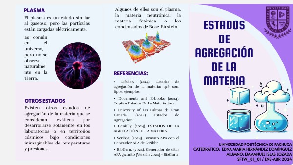 • Lifeder. (2024). Estados de agregación de la materia: qué son, tipos, ejemplos. • Documents and E-books. (2024). Triptico Estados De La Materia.docx. • University of Las Palmas de Gran Canaria. (2024). Estados de Agregacion. • Genially. (2024). ESTADOS DE LA AGREGACIÓN DE LA MATERIA. • Scribbr. (2024). Formato APA con el Generador APA de Scribbr. • BibGuru. (2024). Generador de citas APA gratuito [Versión 2024] - BibGuru