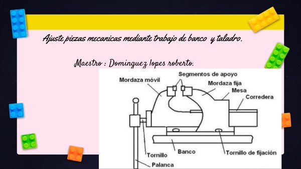 coloca las piezas en el tonillo de banco de manera que queden vien sujetas y niveladas . esto garantiza un trabajo pecioso y evita movimientos no deseados durante las operaciones de macanisado .