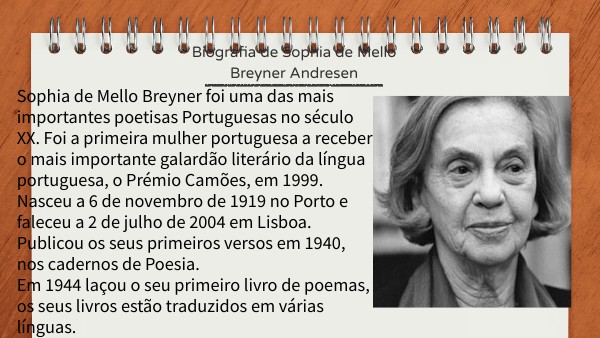 Sophia de Mello Breyner foi uma das mais importantes poetisas Portuguesas no século XX. Foi a primeira mulher portuguesa a receber o mais importante galardão literário da língua portuguesa, o Prémio Camões, em 1999. Nasceu a 6 de novembro de 1919 no Porto e faleceu a 2 de julho de 2004 em Lisboa. Publicou os seus primeiros versos em 1940, nos cadernos de Poesia. Em 1944 laçou o seu primeiro livro de poemas, os seus livros estão traduzidos em várias línguas.