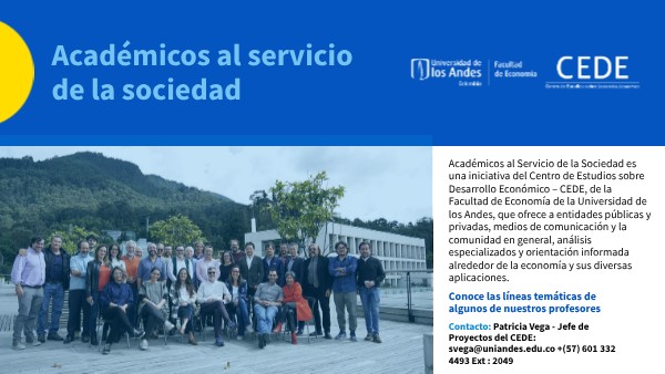 Académicos al Servicio de la Sociedad es una iniciativa del Centro de Estudios sobre Desarrollo Económico – CEDE, de la Facultad de Economía de la Universidad de los Andes, que ofrece a entidades públicas y privadas, medios de comunicación y la comunidad en general, análisis especializados y orientación informada alrededor de la economía y sus diversas aplicaciones.