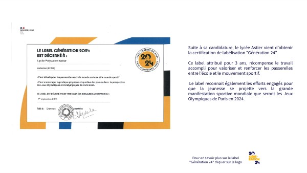 Suite à sa candidature, le lycée Astier vient d'obtenir la certification de labélisation "Génération 24". Ce label attribué pour 3 ans, récompense le travail accompli pour valoriser et renforcer les passerelles entre l'école et le mouvement sportif. Le label reconnait également les efforts engagés pour que la jeunesse se projette vers la grande manifestation sportive mondiale que seront les Jeux Olympiques de Paris en 2024.
