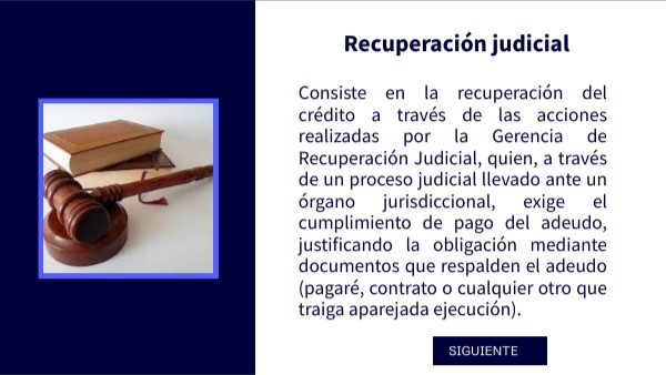 Consiste en la recuperación del crédito a través de las acciones realizadas por la Gerencia de Recuperación Judicial, quien, a través de un proceso judicial llevado ante un órgano jurisdiccional, exige el cumplimiento de pago del adeudo, justificando la obligación mediante documentos que respalden el adeudo (pagaré, contrato o cualquier otro que traiga aparejada ejecución).