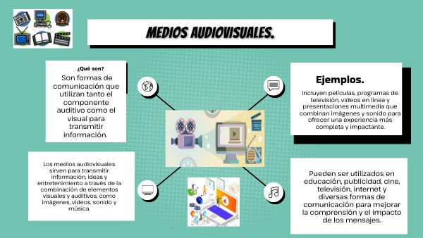 Los medios audiovisuales sirven para transmitir información, ideas y entretenimiento a través de la combinación de elementos visuales y auditivos, como imágenes, videos, sonido y música.