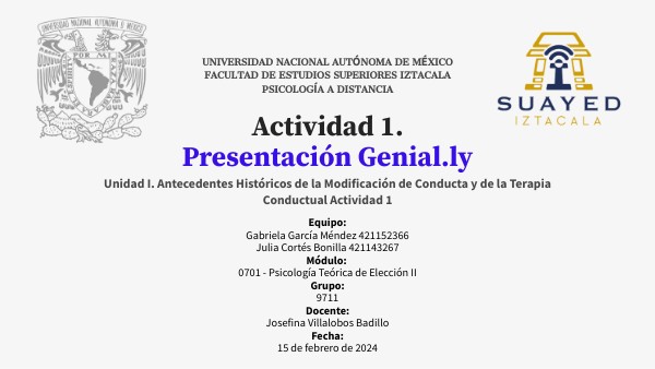 Equipo:Gabriela García Méndez 421152366 Julia Cortés Bonilla 421143267 Módulo: 0701 - Psicología Teórica de Elección II Grupo: 9711 Docente: Josefina Villalobos Badillo Fecha: 15 de febrero de 2024