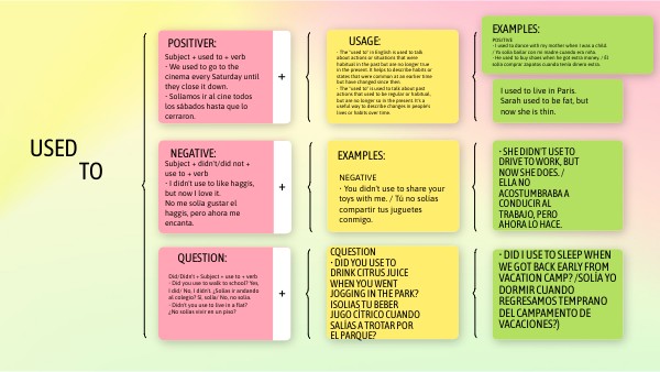 POSITIVE• I used to dance with my mother when I was a child. / Yo solía bailar con mi madre cuando era niña. • He used to buy shoes when he got extra money. / Él solía comprar zapatos cuando tenía dinero extra.