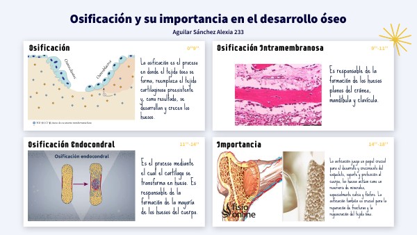 La osificación es el proceso en donde el tejido óseo se forma, reemplaza el tejido cartilaginoso preexistente y, como resultado, se desarrollan y crecen los huesos.