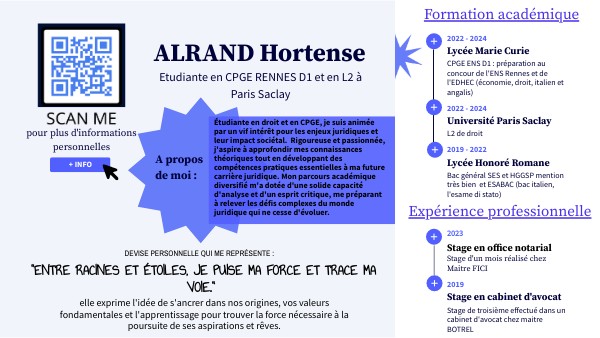 Étudiante en droit et en CPGE, je suis animée par un vif intérêt pour les enjeux juridiques et leur impact sociétal. Rigoureuse et passionnée, j'aspire à approfondir mes connaissances théoriques tout en développant des compétences pratiques essentielles à ma future carrière juridique. Mon parcours académique diversifié m'a dotée d'une solide capacité d'analyse et d'un esprit critique, me préparant à relever les défis complexes du monde juridique qui ne cesse d'évoluer.