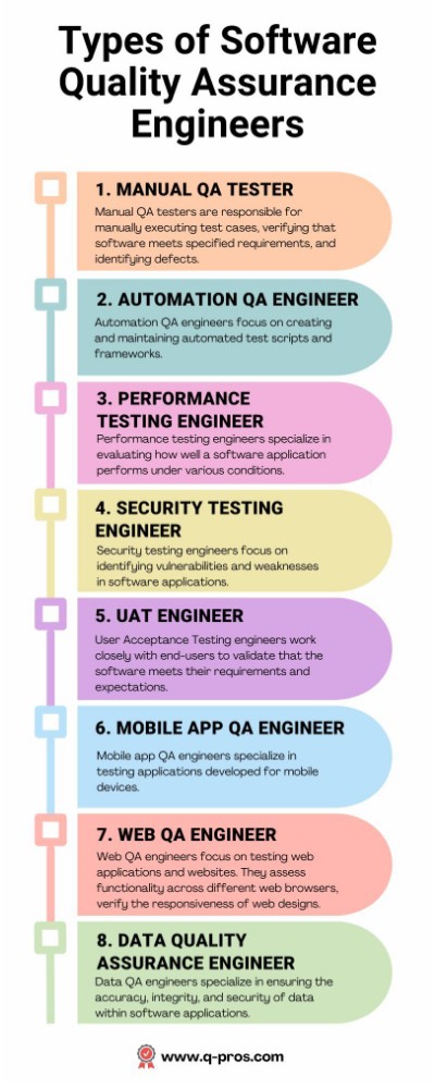 There are many different specialist professions in the field of software quality assurance, each concentrating on specific aspects of the testing and quality control procedure. In this infographic, you will come to know about types of software quality assurance engineers.