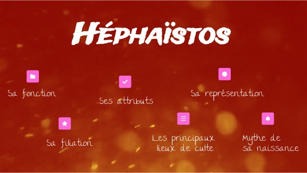 La fonction du dieu Héphaïstos est créateur du feu souterrain. C’est grâce à lui que nous avons du feu dans les foyers domestiques et artisanaux. Il est le dieu le plus laid car il est mal proportionné, court et large, barbu, poilu et il boite.