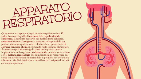 Quasi senza accorgercene, ogni minuto respiriamo circa 15 volte. Lo scopo è quello di estrarre dal corpo l'anidride carbonica, la sostanza di scarto, del metabolismo cellulare, sostituendola con l'ossigeno, la sostanza indispensabile per portare a termine quei processi cellulari che ci permettono di estrarre l'energia chimica contenuta nelle sostanze alimentari. Il sistema respiratorio svolge la parte principale di questo importante scambio gassoso, collaborando in modo strettissimo con il sistema circolatorio che si incarica sia di raccogliere dal corpo l'anidride carbonica portandola ai polmoni e scaricandola all'esterno, sia di ridistribuire a tutto il corpo l'ossigeno di cui si è caricato nei polmoni.