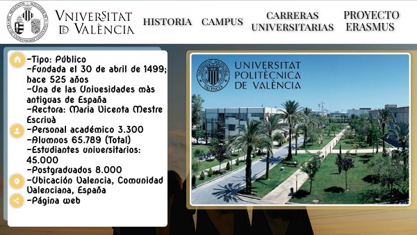 -Tipo: Público -Fundada el 30 de abril de 1499; hace 525 años -Una de las Univesidades màs antiguas de España -Rectora: Maria Vicenta Mestre Escrivà -Personal académico 3.300 -Alumnos 65.789 (Total) -Estudiantes universitarios: 45.000 -Postgraduados 8.000 -Ubicación Valencia, Comunidad Valenciana, España -Página web