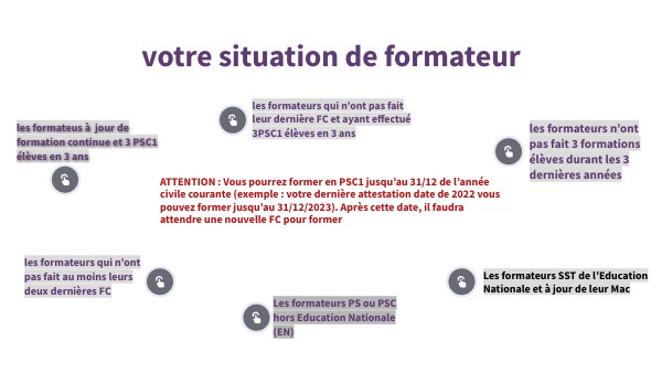 ATTENTION : Vous pourrez former en PSC1 jusqu’au 31/12 de l’année civile courante (exemple : votre dernière attestation date de 2022 vous pouvez former jusqu’au 31/12/2023). Après cette date, il faudra attendre une nouvelle FC pour former