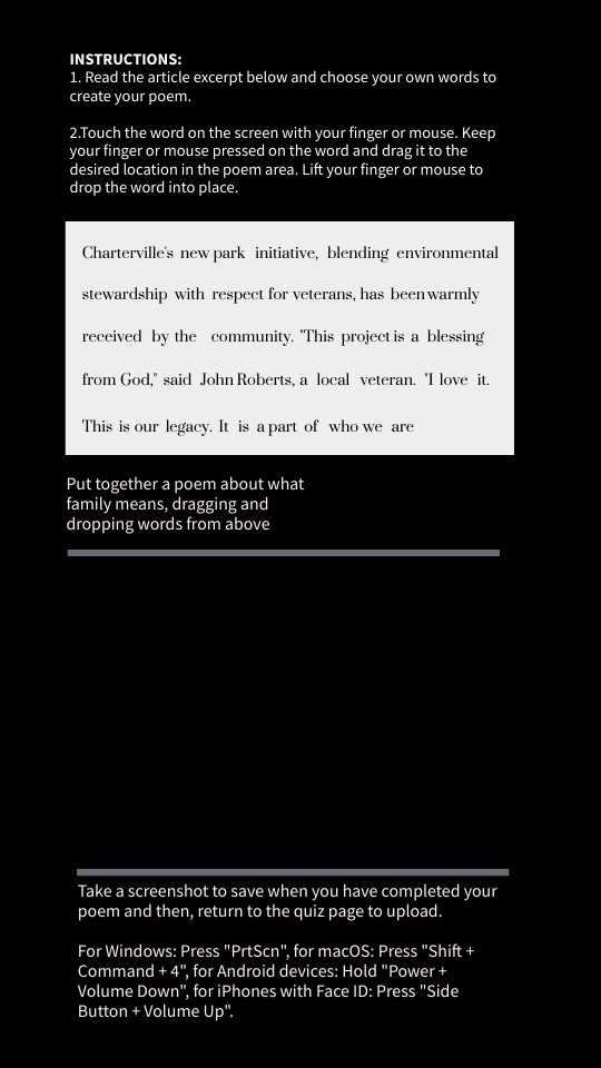 INSTRUCTIONS:1. Read the article excerpt below and choose your own words to create your poem. 2.Touch the word on the screen with your finger or mouse. Keep your finger or mouse pressed on the word and drag it to the desired location in the poem area. Lift your finger or mouse to drop the word into place.