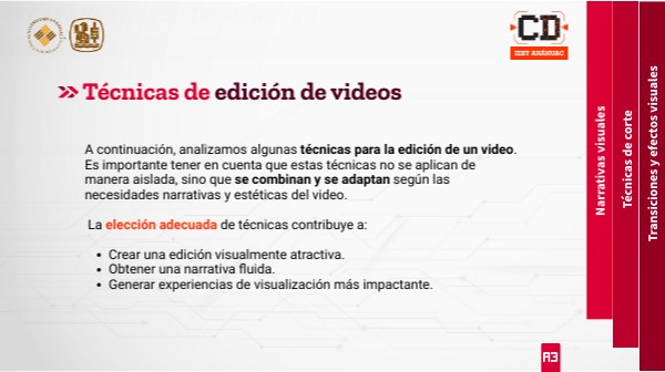A continuación, analizamos algunas técnicas para la edición de un video. Es importante tener en cuenta que estas técnicas no se aplican de manera aislada, sino que se combinan y se adaptan según las necesidades narrativas y estéticas del video. La elección adecuada de técnicas contribuye a: