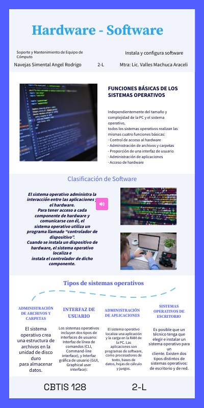 Independientemente del tamaño y complejidad de la PC y el sistema operativo, todos los sistemas operativos realizan las mismas cuatro funciones básicas: · Control de acceso al hardware · Administración de archivos y carpetas · Proporción de una interfaz de usuario · Administración de aplicaciones · Acceso de hardware