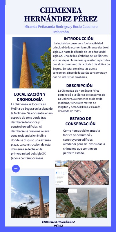 La Chimenea de Hernández Pérez perteneció a la fábrica de conservas de La Molinera.La chimenea es de estilo moderno, tiene siete metros de longitud y pesa 500 kilos, es la más decorada de todas