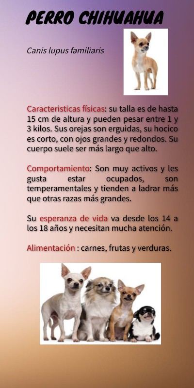 Caracteristicas físicas: su talla es de hasta 15 cm de altura y pueden pesar entre 1 y 3 kilos. Sus orejas son erguidas, su hocico es corto, con ojos grandes y redondos. Su cuerpo suele ser más largo que alto. Comportamiento: Son muy activos y les gusta estar ocupados, son temperamentales y tienden a ladrar más que otras razas más grandes. Su esperanza de vida va desde los 14 a los 18 años y necesitan mucha atención. Alimentación : carnes, frutas y verduras.