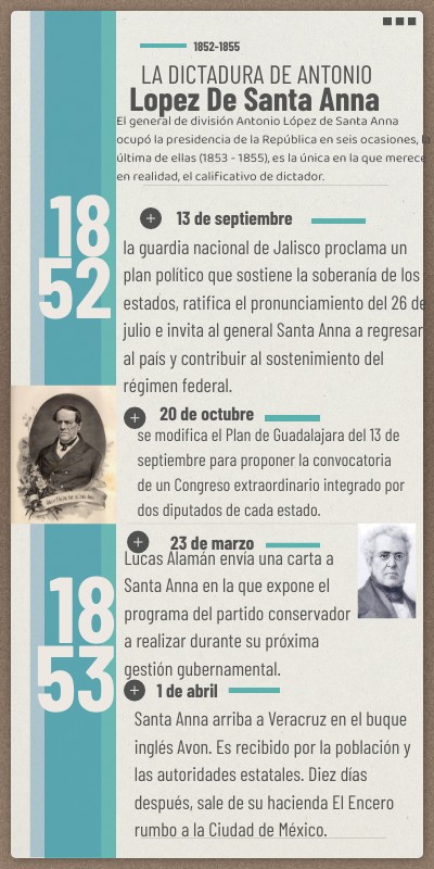 El general de división Antonio López de Santa Anna ocupó la presidencia de la República en seis ocasiones, la última de ellas (1853 - 1855), es la única en la que merece en realidad, el calificativo de dictador.