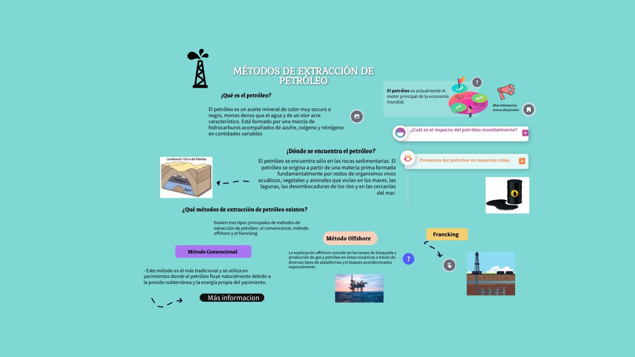 Existen tres tipos principales de métodos de extracción de petróleo: el convencional, método offshore y el francking.