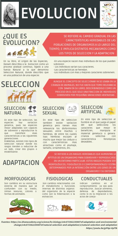 Fuentes: https://es.khanacademy.org/science/hs-biology/x4c673362230887ef:adaptation-and-environmental-change/x4c673362230887ef:natural-selection-and-adaptation/v/natural-selection-and-adaptationhttps://youtu.be/g4Yqz-GpTlk