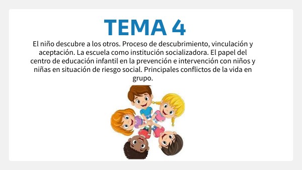 El niño descubre a los otros. Proceso de descubrimiento, vinculación y aceptación. La escuela como institución socializadora. El papel del centro de educación infantil en la prevención e intervención con niños y niñas en situación de riesgo social. Principales conflictos de la vida en grupo.