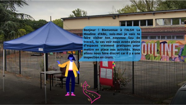 Bonjour ! Bienvenue à l'ALSH La Mouline d'Albi, suis-moi je vais te faire visiter ton nouveau lieu de travail, tu vas voir nous avons pleins d'espaces vraiment pratiques pour mettre en place nos activités. Nous allons nous faire discret car il y a une inspection en cours.