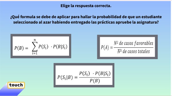 Elige la respuesta correcta. ¿Qué formula se debe de aplicar para hallar la probabilidad de que un estudiante seleccionado al azar habiendo entregado las prácticas apruebe la asignatura?