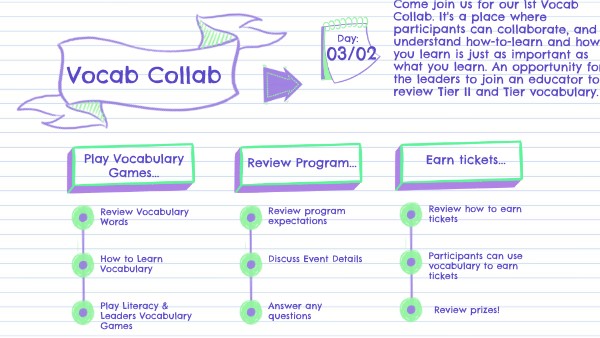 Come join us for our 1st Vocab Collab. It's a place where participants can collaborate, and understand how-to-learn and how you learn is just as important as what you learn. An opportunity for the leaders to join an educator to review Tier II and Tier vocabulary.