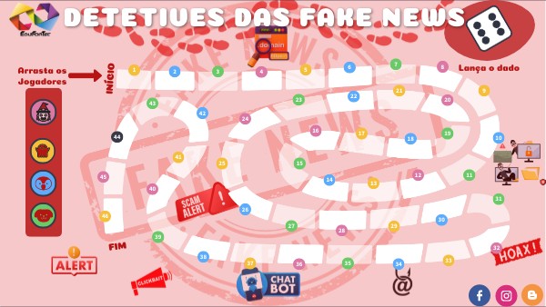 Jogo de tabuleiro que permite tomar conhecimento sobre o que são notícias falsas ou fake news. Permite 4 jogadores com idades compreendidas entre 9 aos 12 anos.