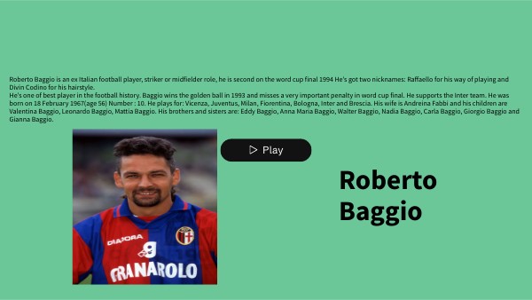 Roberto Baggio is an ex Italian football player, striker or midfielder role, he is second on the word cup final 1994 He’s got two nicknames: Raffaello for his way of playing and Divin Codino for his hairstyle.He’s one of best player in the football history. Baggio wins the golden ball in 1993 and misses a very important penalty in word cup final. He supports the Inter team. He was born on 18 February 1967(age 56) Number : 10. He plays for: Vicenza, Juventus, Milan, Fiorentina, Bologna, Inter and Brescia. His wife is Andreina Fabbi and his children are Valentina Baggio, Leonardo Baggio, Mattia Baggio. His brothers and sisters are: Eddy Baggio, Anna Maria Baggio, Walter Baggio, Nadia Baggio, Carla Baggio, Giorgio Baggio and Gianna Baggio.