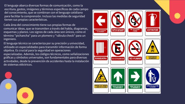 El lenguaje abarca diversas formas de comunicación, como la escritura, gestos, imágenes y términos específicos de cada campo del conocimiento, que se combinan con el lenguaje cotidiano para facilitar la comprensión. Incluso las medidas de seguridad tienen sus propias características.