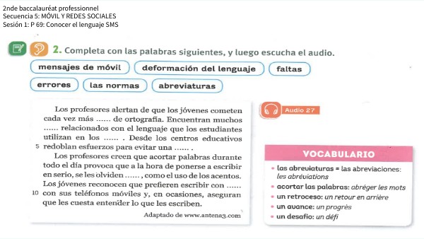 Secuencia 5: MÓVIL Y REDES SOCIALES. Sesión 1: P 69: Conocer el lenguaje SMS. 2. Completa con las palabras siguientes, y luego escucha el audio.