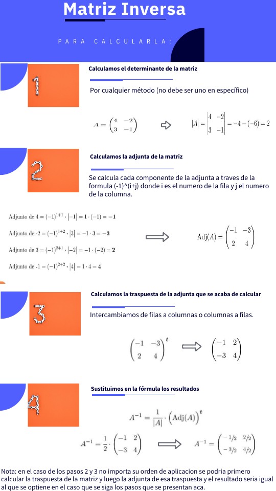 Nota: en el caso de los pasos 2 y 3 no importa su orden de aplicacion se podria primero calcular la traspuesta de la matriz y luego la adjunta de esa traspuesta y el resultado seria igual al que se optiene en el caso que se siga los pasos que se presentan aca.