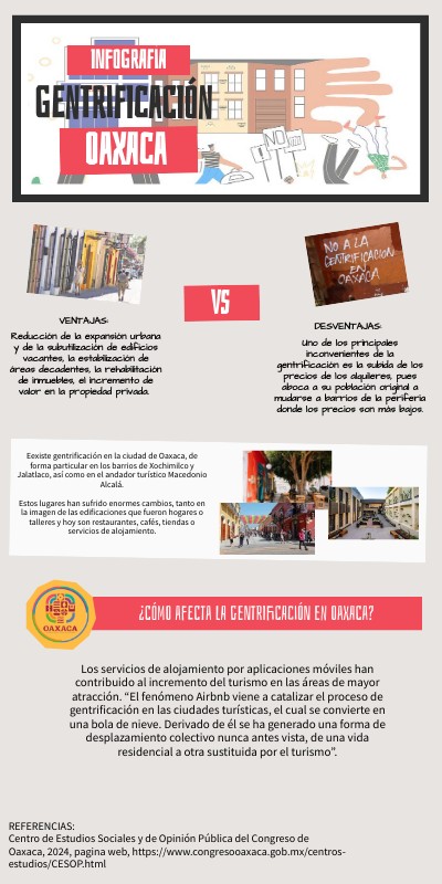 Eexiste gentrificación en la ciudad de Oaxaca, de forma particular en los barrios de Xochimilco y Jalatlaco, así como en el andador turístico Macedonio Alcalá. Estos lugares han sufrido enormes cambios, tanto en la imagen de las edificaciones que fueron hogares o talleres y hoy son restaurantes, cafés, tiendas o servicios de alojamiento.