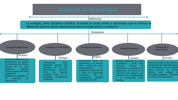 La ecología, como disciplina científica, se divide en varias ramas o subcampos que se centran en diferentes aspectos de las interacciones entre los organismos y su entorno.