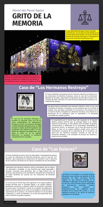 El mural simboliza la persistencia de la memoria colectiva en relación con las violaciones de derechos humanos, como el caso de los hermanos Restrepo en Ecuador, representa la importancia de recordar y honrar a las víctimas de estos crímenes, así como la lucha continua por la justicia y la rendición de cuentas.