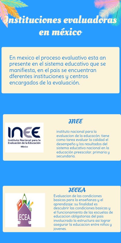 En mexico el proceso evaluativo esta an presente en el sistema educativo que se manifiesta, en el pais se encuentran dferentes instituciones y centros encargados de la evaluación.