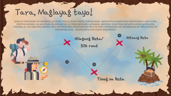 Ikaw ay naatasan na sumama sa isang paglalayag Upang mangalakal. Maraming kuwentong nakatatakot ang iyong narinig hinggil sa halimaw ng karagatan at mga barkong lumubog. Mayroon ding mga barkong hindi na muling nakabalik. Sa kabilang banda, may kayamanang naghihintay para sa mga indibidwal na nakibahagi sa paglalayag at pangangalakal. Anong Ruta ang iyong dadaanan?